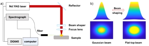 在優(yōu)化激光等離子體激發(fā)條件方面,華中科技大學武漢光電國家研究中心的李青洲等[7]采用激光誘導(dǎo)擊穿光譜結(jié)合激光誘導(dǎo)熒光(Laser-Induced Breakdown Spectroscopy combined with Laser-Induced Fluorescence, LIBS-LIF)提高鈾礦石中的鈾特征譜線強度;研究結(jié)果表明,與僅采用LIPS技術(shù)相比,采用LIBS-LIF技術(shù)后U II 409.01 nm特征譜線強度提升21.3倍,鈾元素檢出限(LoD)由199 ppm下降至35 ppm。清華大學姬建訓(xùn)等[8]通過將入射激光整形為平頂光束,有效改善了激光強度的空間分布,降低了激光與等離子體作用過程中的等離子體屏蔽效應(yīng),提高了等離子體輻射光譜強度。實驗裝置和光束整形如圖4所示,研究結(jié)果表明,光束整形后,鈾礦石中鈾元素特征譜線U II 409.013 nm強度提升約5倍,鈾元素檢出限達到21.2 ppm。中國原子能科學研究院高智星等[9]研發(fā)的背負式LIPS裝置通過提升激光-等離子體閃光傳輸效率,將鈾礦石中鈾元素的檢出限降低至18 ppm。激光等離子體激發(fā)條件的優(yōu)化僅需對裝置硬件進行簡單改進即可有效改善LIPS探測限,無需進行樣品前處理,時效性好,適用于鈾礦石的原位、現(xiàn)場、快速分析。