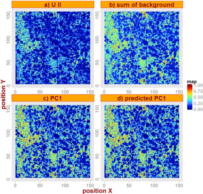 在天然鈾礦石中,鈾元素并不是均勻分布的。鈾元素空間分布特性反應(yīng)了成礦環(huán)境信息,對探索鈾礦的形成和演化過程至關(guān)重要。在單點檢測的基礎(chǔ)上,研究人員開始采用LIPS技術(shù)對鈾礦石中的鈾元素分布進行分析。捷克布爾諾理工大學的J. Klus等采用正交雙脈沖LIPS對鈾礦石中的鈾元素進行檢測,在此基礎(chǔ)上對鈾元素的含量分布進行分析,獲得了鈾元素的二維分布圖;如圖5所示,鈾元素的二維分布的空間分辨率達到100 mm。捷克馬薩里克大學M. Hola等[12]將LIPS技術(shù)與激光燒蝕電感耦合等離子體質(zhì)譜(Laser Ablation-Inductively Coupled Plasma Mass Spectrometry, LA-ICP-MS)技術(shù)相結(jié)合對鈾礦石中的鈾(U)、鐵(Fe)、鉛(Pb)、鈣(Ca)等多種元素進行綜合分析,獲得了元素二維空間分布圖;其中LIPS被用于元素分布的整體快速成像,可以在20分鐘內(nèi)獲取4.0´23.2 mm范圍內(nèi),51´290個點位的元素分布圖像,空間分辨率為80 mm。LIPS技術(shù)具有掃描速度快、空間分辨率高的獨特優(yōu)勢,但掃描過程受基體效應(yīng)影響較大,在檢測非均勻樣品時,樣品密度、硬度、元素含量的變化均會對檢測結(jié)果造成干擾。因此,根據(jù)檢測對象物理、化學特性的變化對特征譜線強度進行補償,突破不同基體下鈾礦石元素分布的精準定量,將是LIPS技術(shù)的研究重點。