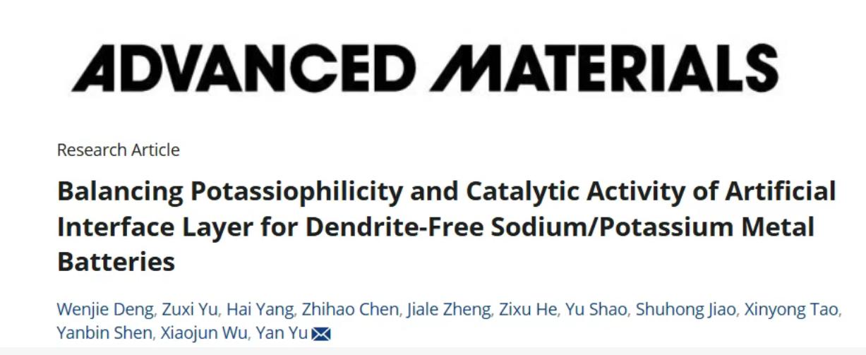 該成果以“Balancing Potassiophilicity and Catalytic Activity of Artificial Interface Layer for Dendrite-Free Sodium/Potassium Metal Batteries”為題發(fā)表在《Advanced Materials》期刊,第一作者是鄧文杰。