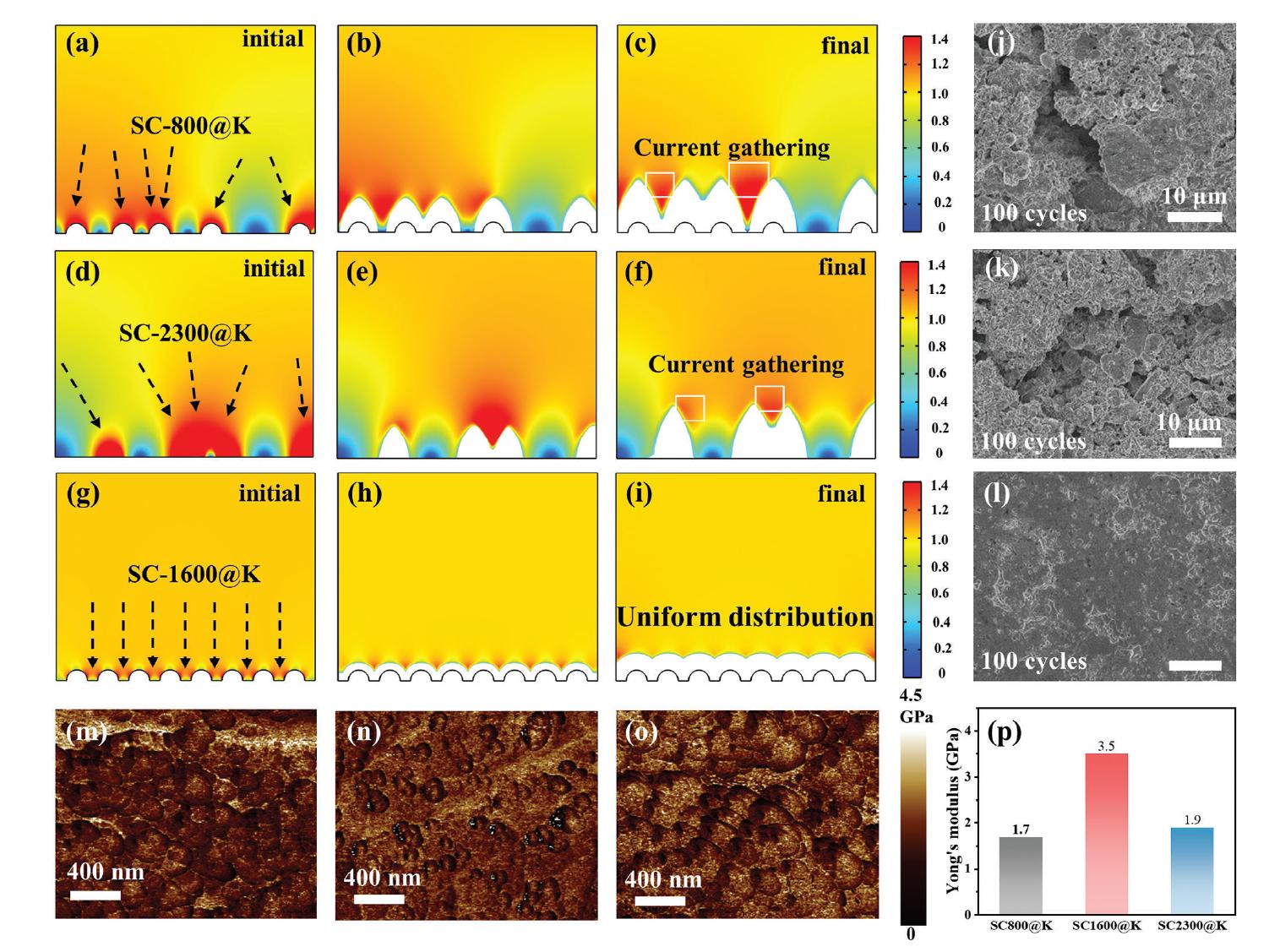 圖2:COMSOL多物理場(chǎng)模擬的2D電流密度分布。a-c) SC-800@K,d-f) SC-2300@K,g-i) SC-1600@K。j) SC-800@K,k) SC-2300@K,l) SC-1600@K復(fù)合陽極在0.5 mA cm-2電流密度下經(jīng)過100個(gè)循環(huán)后的表面形貌。m) SC-800@K,n) SC-1600@K,o) SC-2300@K在0.5 mA cm-2電流密度下經(jīng)過5個(gè)循環(huán)后的SEI層楊氏模量的分布。p) 對(duì)應(yīng)的楊氏模量值。