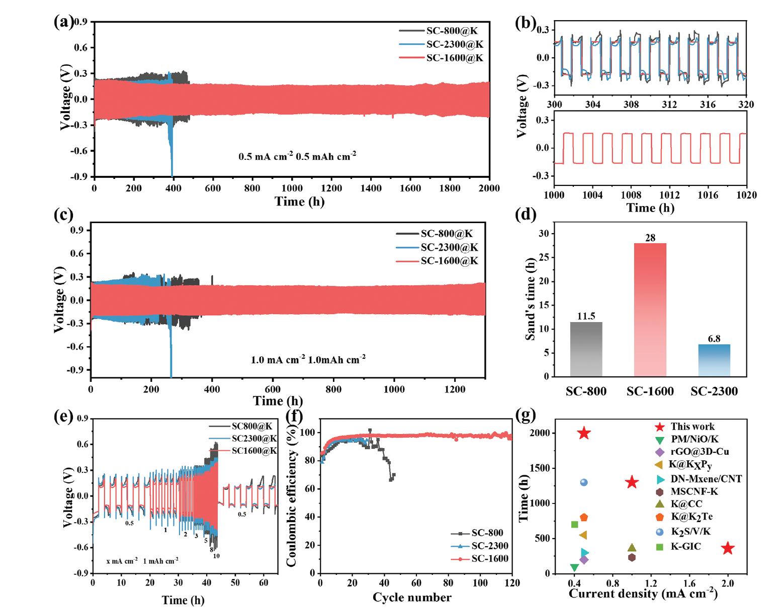 圖3:復(fù)合電極的電化學(xué)性能。a) SC-X@K在對(duì)稱電池中的循環(huán)穩(wěn)定性,在0.5 mA cm-2電流密度下,容量為0.5 mAh cm-2。b) a)中約300和1000小時(shí)的放大曲線。c) SC-X@K在對(duì)稱電池中的循環(huán)穩(wěn)定性,在1 mA cm-2電流密度下,固定容量為1 mAh cm-2。d) 不同復(fù)合陽極的Sand's時(shí)間值。e) SC-X@K在0.5至10 mA cm-2的固定容量1 mAh cm-2下的倍率性能。f) 在0.5 mA cm-2和0.5 mAh cm-2下,SC-X電極上鉀鍍/剝離的庫侖效率。g) SC-1600@K復(fù)合陽極與其他報(bào)道的鉀陽極的電化學(xué)性能比較。