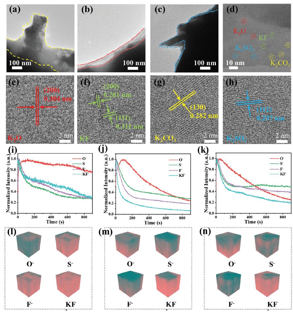 圖4:SC-800@K,SC-1600@K和SC-2300@K表面的Cryo-TEM圖像。a) SC-800@K,b) SC-1600@K,c) SC-2300@K以及SC-1600@K的SEI層的相組成d-h。ToF-SIMS深度剖析和O−,S−,F(xiàn)−和KF−在i,l) SC-800@K,j,m) SC-1600@K,k,n) SC-2300@K表面的分布,這些是在0.5 mA cm-2電流密度下,容量為0.5 mAh cm-2經(jīng)過5個(gè)循環(huán)后的圖像(在l-n中,青色區(qū)域代表單個(gè)片段離子,而粉色區(qū)域代表背景)。