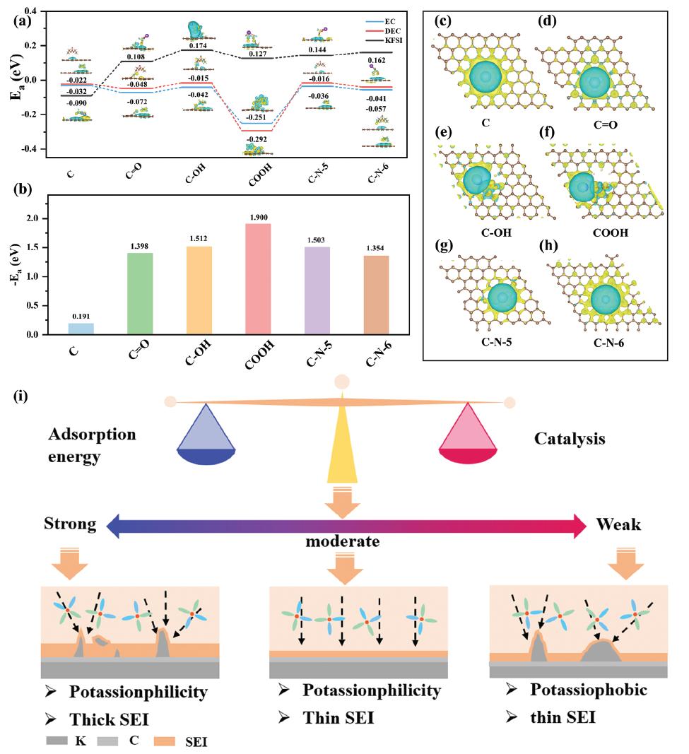 圖5:a) EC,DEC和KFSI在不同碳構(gòu)型表面上的結(jié)合能。b) K離子在不同碳構(gòu)型表面上的吸附能,以及c-h)相應(yīng)的差分電荷密度。i) 吸附能和催化能力對(duì)K沉積和SEI形成的影響。
