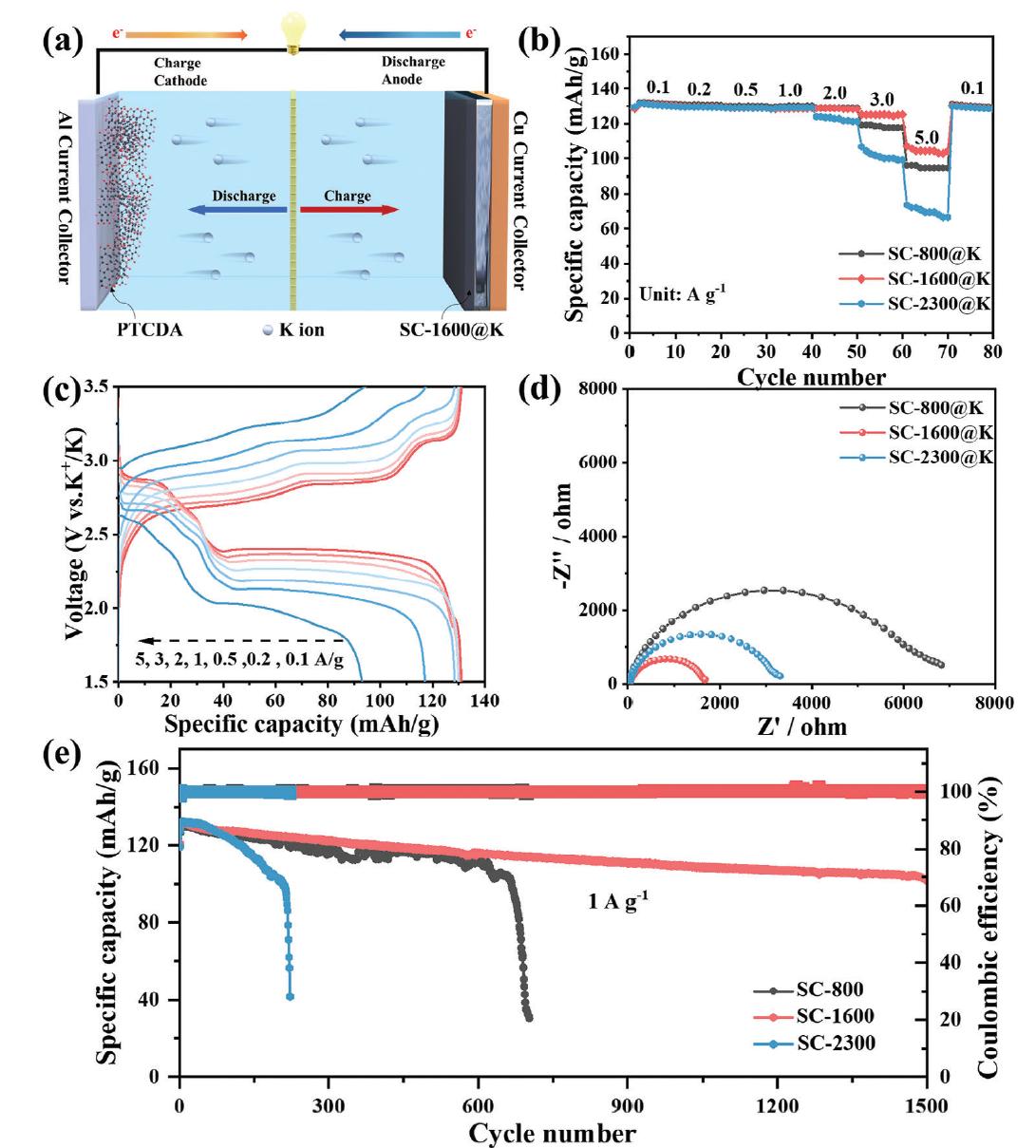 圖6:PTCDA//SC-X@K的電化學(xué)性能。a) PTCDA//SC-1600@K電池的示意圖。b) 全電池的倍率性能。c) 不同電流密度下PTCDA//SC-1600@K全電池的充放電曲線。d) 10個(gè)循環(huán)后全電池的電化學(xué)阻抗譜。e) 在1 A g-1電流密度下的循環(huán)穩(wěn)定性。