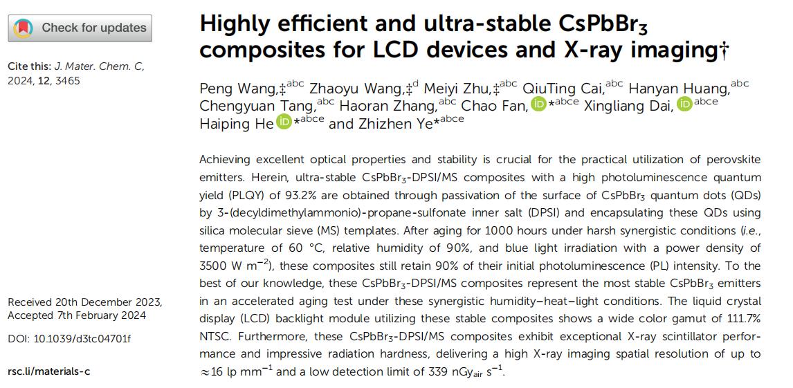 近日,浙江大學(xué)材料學(xué)院葉志鎮(zhèn)院士團(tuán)隊(duì)在高光效、高穩(wěn)定鈣鈦礦復(fù)合結(jié)構(gòu)方面取得重要進(jìn)展,研究成果以“Highly efficient and ultra-stable CsPbBr3 composites for LCD devices and X-ray imaging”為題發(fā)表在國(guó)際知名學(xué)術(shù)期刊Journal of Materials Chemistry C (doi:10.1039/d3tc04701f)上。浙江大學(xué)為該論文第一單位,王朋博士、王昭宇博士、朱美怡博士為共同第一作者,葉志鎮(zhèn)院士、何海平教授、樊超博士為共同通訊作者。