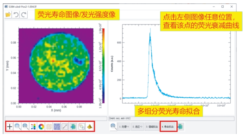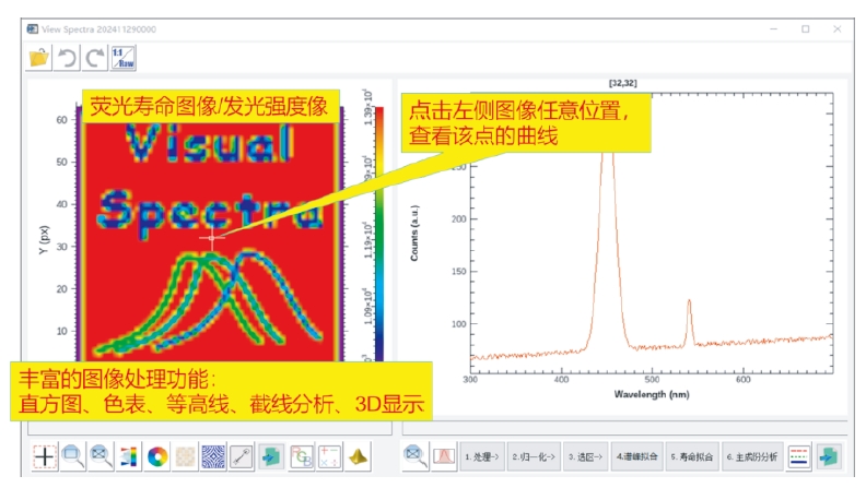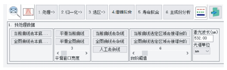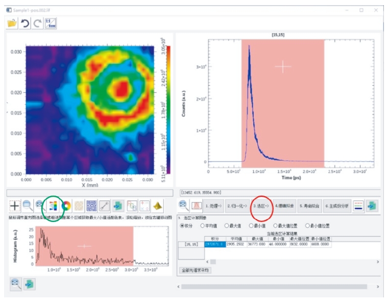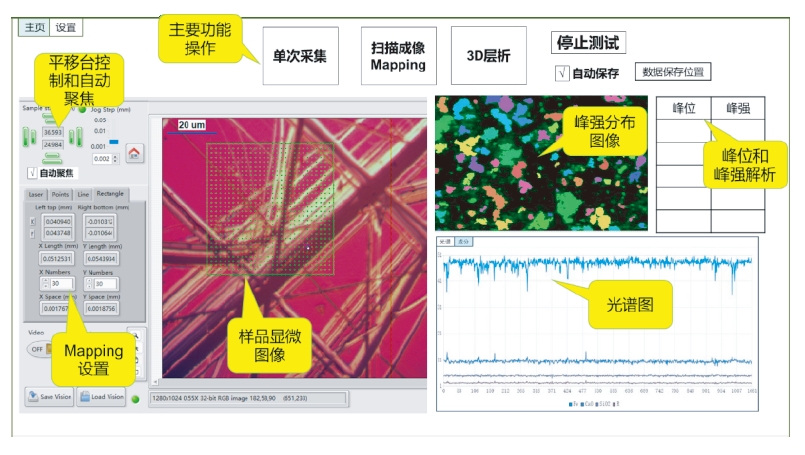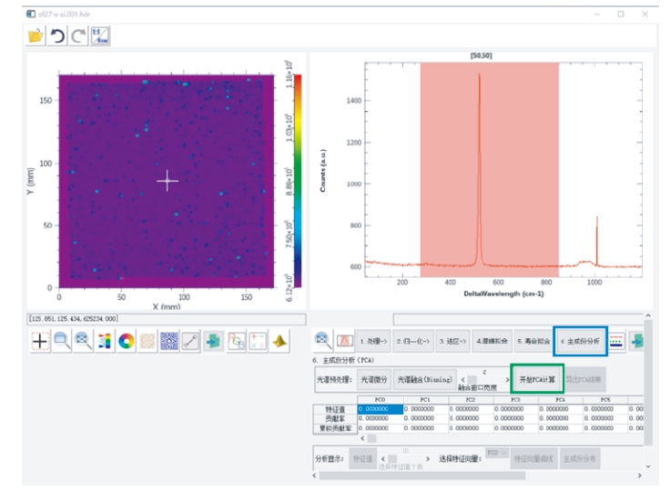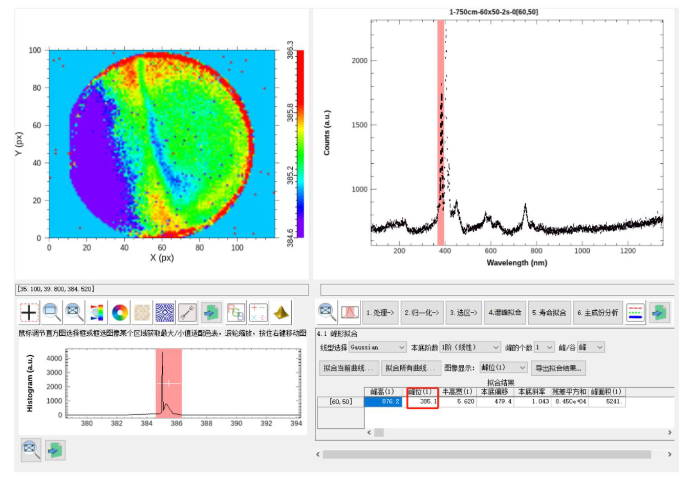 可對(duì)光譜峰位、峰高和半高寬等進(jìn)行擬合??勺詣?dòng)擬合并計(jì)算應(yīng)力、晶化率、載流子濃度等信息,樣品數(shù)據(jù)庫(kù)可定制。主成分分析(PCA)和k-均值聚類處理模塊。將擬合結(jié)果以二維圖像方式顯示。 |