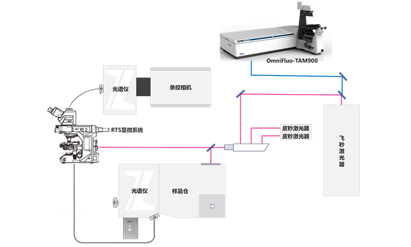 基于RTS2 顯微系統(tǒng)而搭建,集成拉曼/熒光/光電流原位測(cè)試功能。該系統(tǒng)可原位探測(cè)拉曼、熒光及光電流信號(hào)。配合高精度微米電動(dòng)位移臺(tái),實(shí)現(xiàn)Raman Mapping,PL Mapping以及激光誘導(dǎo)光電流成像(LBIC)。深度表征材料內(nèi)部的分子振動(dòng)能級(jí)與轉(zhuǎn)動(dòng)能級(jí)結(jié)構(gòu)信息,光生載流子的生成與復(fù)合機(jī)制,器件吸收和電荷生成的微區(qū)特性,光電材料界面以及半導(dǎo)體結(jié)區(qū)的品質(zhì)分布等特性。